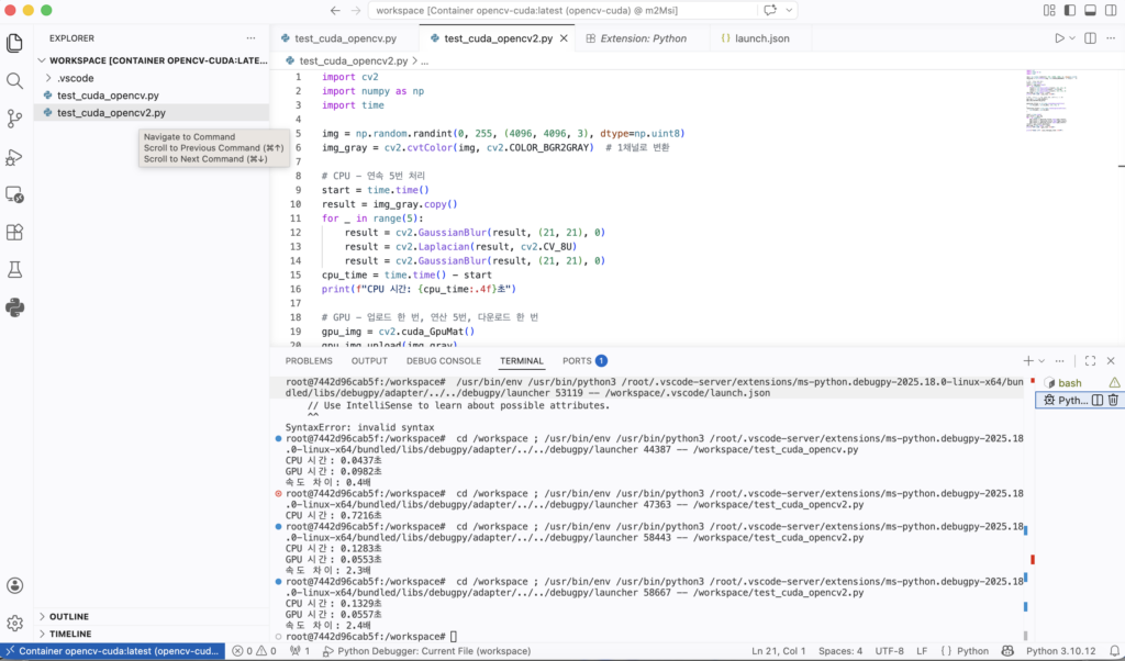 To use CUDA acceleration with OpenCV, pip install opencv-python simply won’t cut it. CUDA support requires building OpenCV from source. In this post, I’ll show you how to set up a clean, isolated development environment using Docker — without polluting your host system — and debug your code directly inside the container using VSCode.